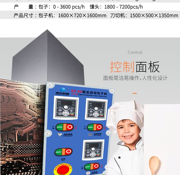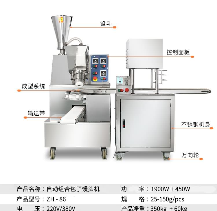 名稱ZH-86型自動組合包子饅頭機 電源220/380V(見機器名牌) 功率1.9+0.45kw 產量包子0-3600個/小時,饅頭1800-7200個/小時 尺寸包子機1600×720×1600mm(包括輸送帶),刀切機1500*500*1350mm 重量包子機350kg 饅頭機60kg 規格25-150克/個 其他