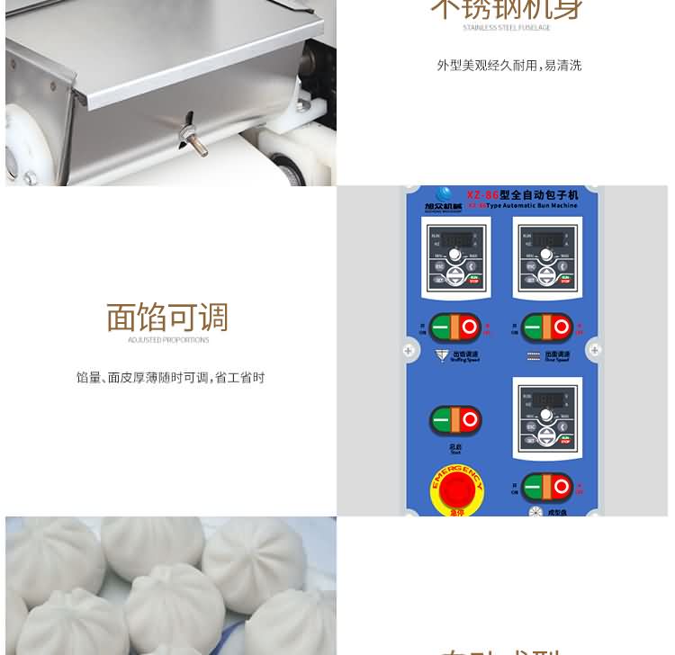 ZH-86型自動組合式包子饅頭機是一款產品性能穩定、自動化程度高,功能多且產品多樣化的設備。采用高品質微電腦變頻控制面板、電機電器,操作更方便、維護更簡單;不銹鋼制作、經久耐用、美觀衛生;可生產花包、光頭包、圓饅頭、南瓜餅、月餅、小籠包和各種肉餡、菜餡、純白糖餡、芝麻餡、豆腐餡等各種包餡食品。