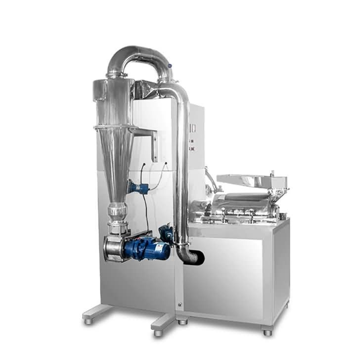 以電機帶動傳動軸高速運轉,物料進入粉碎腔時由前排錘頭進行初次粉碎,形成細小顆粒進入活動錘盤內,經錘盤內的活動錘片及風葉對物料的二次粉碎,最后流向分級腔,由分級盤對物料進行最后的粉碎分級,合格的產品通過分級盤縫隙,經管道進入沙克龍收集器,由卸料器收入接料容器。含塵的氣體則進入除塵柜,經濾袋過濾,粉塵被阻隔在柜中,由脈沖裝置震打而落入收料箱中,凈化的后的氣體經排風口排出箱體。