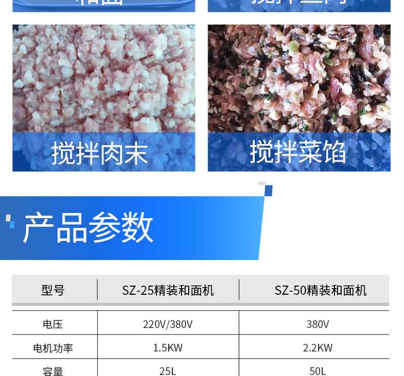 ◆ 精裝和面機有SZ-15、SZ-25、SZ-50型。本機是一種面粉攪拌器,該機適用于企業單位、食堂、招待所、大、中、小餐館、工廠、學校、部隊等。