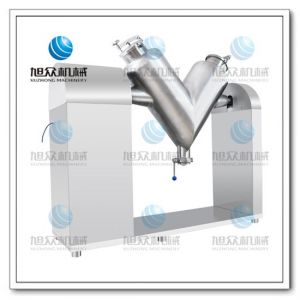 本機通過減速機構帶動筒體旋轉,利用混合機兩圓柱筒長度的不相等形成的不對稱進行混合,當混合機運動時,物料從分解到組合,由于勢能的不同,就產生了一個橫向力,推動物料進行橫向交流。當物料從組合到分解,由于物料平面不同,就產生了一個橫向力又推動物料進行橫向交流。筒體旋轉一周,約使25%的物料從一個筒體流向另一個筒;同時筒體旋轉時又使物料產生徑向流動,這樣物料進行橫向、徑向分解,組合交替進行,使物料達到非常均勻的效果。
