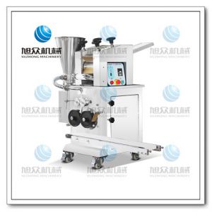 旭眾牌JGB-180型仿手工餃子機是我公司開發生產的先進的自動餃子生產設備。設備包括主動壓皮部分、自動供餡部分、自動包合成型部分、自動成品輸送部分,并且只要更換模具,就可制鍋貼等食品。本機采用自動軋制面皮后包制餃子的新工藝技術,采用多道壓面輥壓面,壓面效果優異,壓出的面皮筋道,進一步提高所包出的餃子口感。