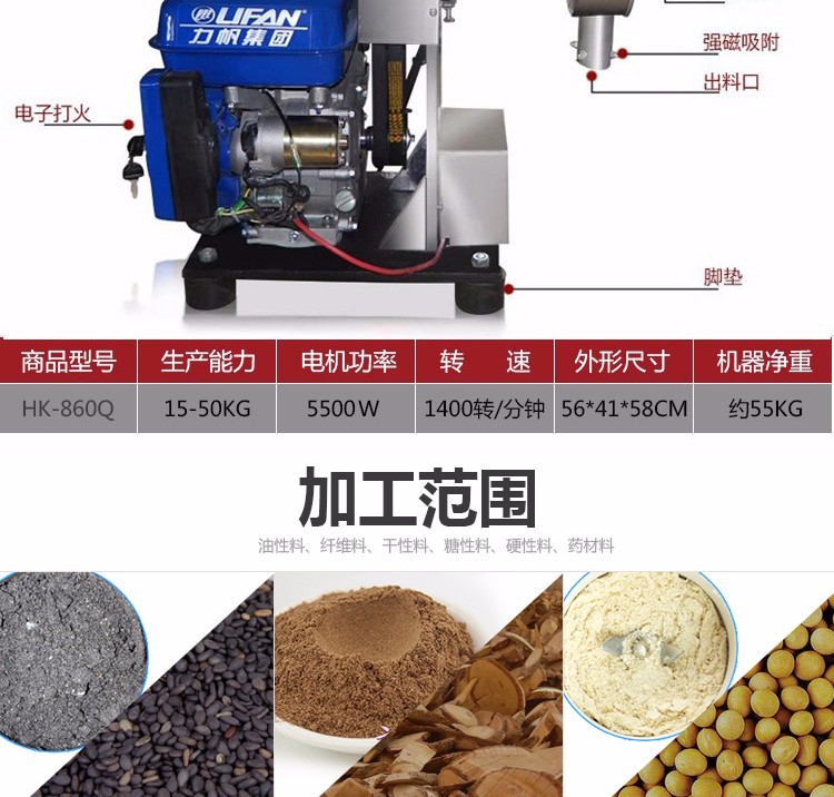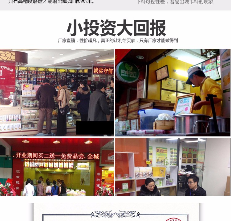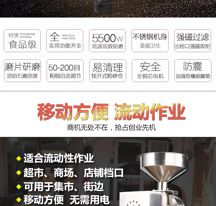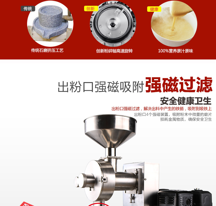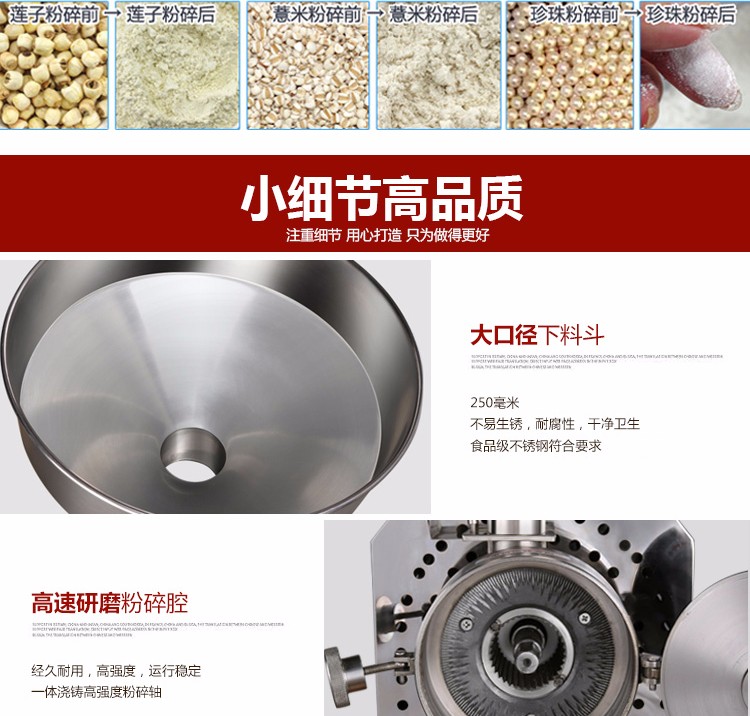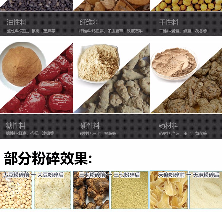 6、適用范圍更廣:適用于超市、商場、店鋪檔口現(xiàn)場加工各種五谷雜糧,和制藥加工廠、醫(yī)院診所等加工中藥材使用,特別適用流動(dòng)作業(yè)。加工范圍廣: