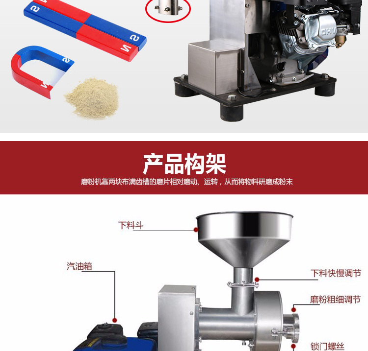 3、提高了機(jī)器零配件加工工藝,改進(jìn)了機(jī)器裝配流程,噪音低、進(jìn)料通暢、下料更快、不堵料,磨粉細(xì)膩、無粉塵。
