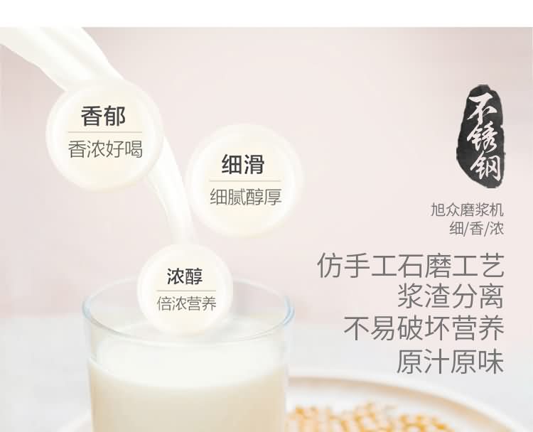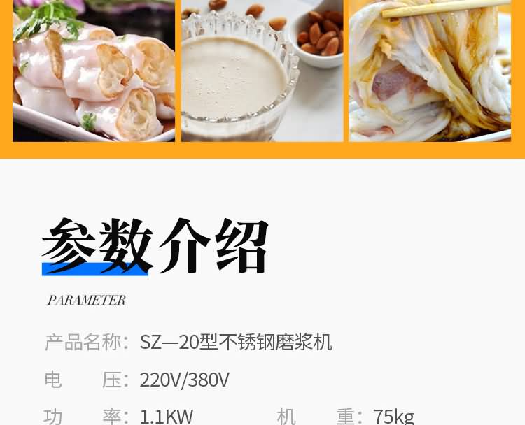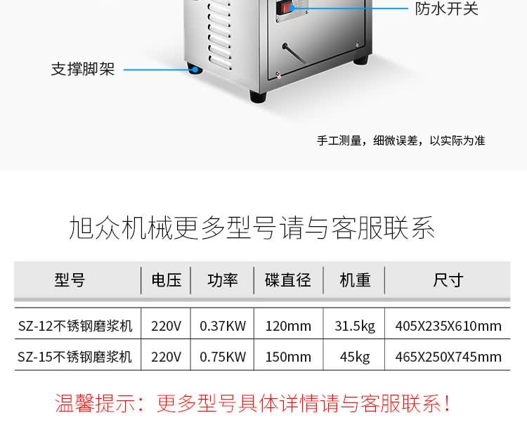 旭眾牌SZ-12/15/20不銹鋼磨漿機結構合理,造型美觀,操作簡便。具有體積小、重量輕、噪音低、省力,性能穩定、質量可靠、容易清洗、移動方便等優點,適用于豆制品廠、飲食服務業、食堂、飯店及個體商戶使用。
