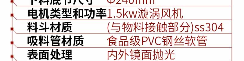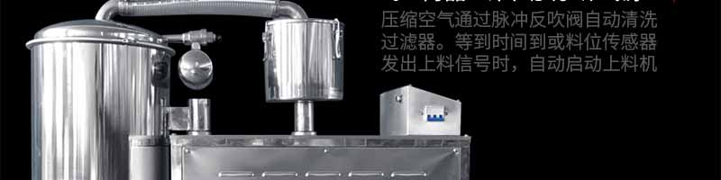 真空上料機由真空泵(無油、無水)、不銹鋼吸料咀、輸送軟管、PE過濾器(或316L不銹鋼過濾器)、壓縮空氣反吹裝置、氣動放料門裝置、真空料斗和料位自動控制裝置等組成,整套系統設計合理、制造精美。