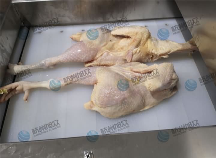 剁雞塊說實話人工真不是很好剁,用勁要大,還要用手固定住防滑,低幾率手殘的人去操作一不注意就會弄傷了手,所以現在菜市場的老板們很多都會提供剁雞塊服務,但是工作效率慢了的話客戶流失就快,于是不如直接購買一臺禽肉類剁塊機,該剁塊機專業剁雞塊、鴨塊的機器,不過建議要微凍禽肉類,那么我們來看看禽肉類剁塊機剁一只雞的效果究竟有多好: