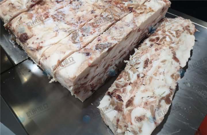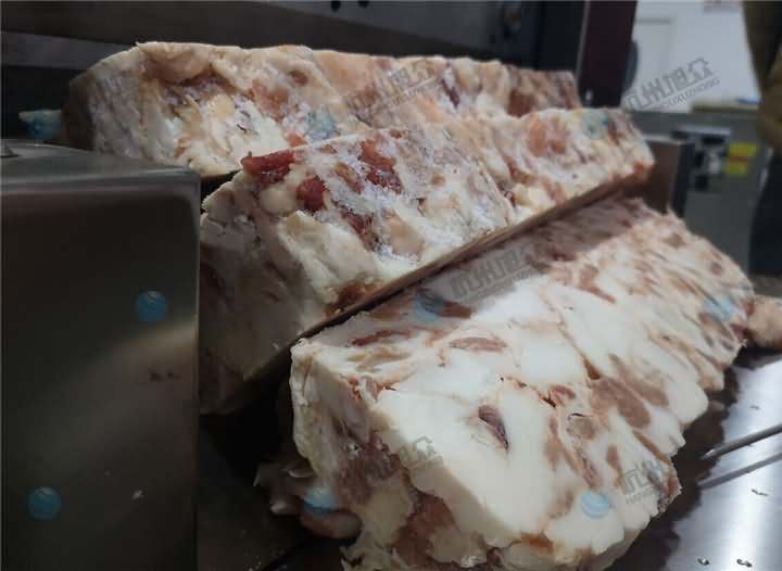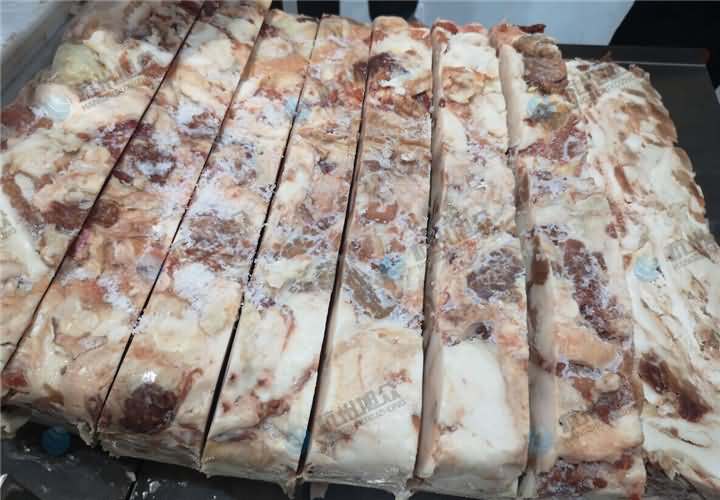 今日上門考察設備的客戶急忙從冷庫中帶了一大塊的凍肉過來,說應也不是特別硬,部分其實都有點化掉了,要求是機器將它切成長條塊就行了,后面切好的塊人工再加工下再放入絞肉機絞碎就行,客戶說主要凍肉人工去切這么一大塊太費勁了,于是根據他的要求推薦了牛羊肉切卷機,該機本身就是切凍肉,切片越薄肉卷就容易成卷,不過切的越厚就直接是塊了,該機切片厚度可調整,于是將它調制成5公分的厚度,那么我們來看看牛羊肉切卷機切凍肉塊效果: