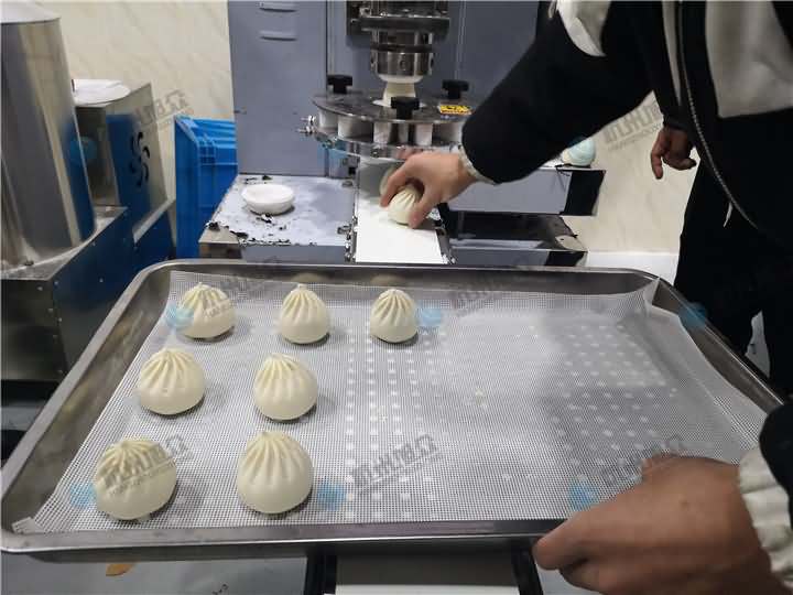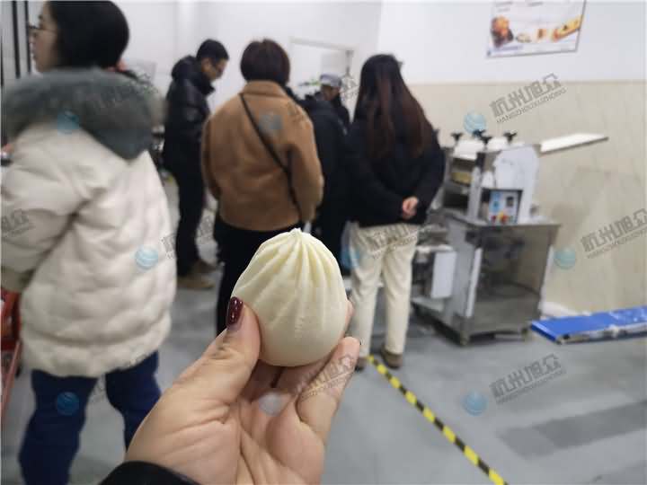 旭眾包子機究竟給人們帶來了多大的方便?今日來了幾波客戶來考察包子機設備,印象比較深的就是要做2種不同餡料的客戶,提前將蔬菜餡寄過來冷藏,今日終于到達還帶了今日剛拌好的肉餡,一個是想看包子機能將兩種肉餡和菜餡包合住,再一個包子機效率及外觀,但是要用價格實惠花紋十二褶的包子機給他演示效果,于是便安排了SZ-612包子機,一小時1800個成品,十二褶花紋,價格方便也算是包子機中第二優惠,在現場的老板們可以很直觀地看到,從和面到做包子全程僅需1-2名師傅便可完成,實際只需一個也可以,只不過多一個人方便快速將成型的包子擺盤好。