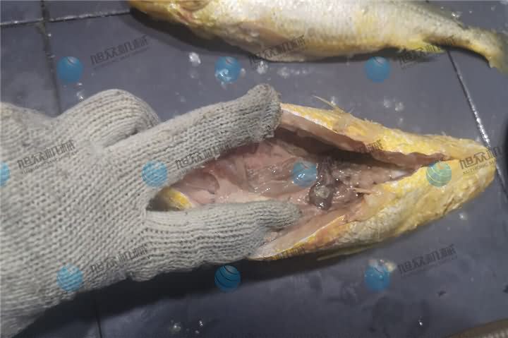 1斤多的黃魚想要開肚去鱗自然得選擇XZ-018開肚去鱗殺魚機(jī),該殺魚機(jī)加工魚常規(guī)款是2-8斤,而1斤多的黃魚則需要0.8-2斤的規(guī)格的殺魚機(jī)器,黃魚比較扁會(huì)稍微開偏一點(diǎn),魚鱗是去的相當(dāng)?shù)母蓛簦蛻艨戳硕颊f這殺魚效率真快,因?yàn)樗麄兪菍iT加工這種黃魚的,每天都要?dú)⒑脦装俳铮斯っ刻於甲霾贿^來,便想著購買全自殺魚機(jī)代替人工開肚去鱗殺魚等工序,于是在網(wǎng)上便找到了旭眾全自動(dòng)殺魚機(jī),撥打4008852117咨詢客服了解基本情況后,帶著黃魚來到現(xiàn)場(chǎng)直觀殺魚機(jī)殺黃魚的效果: