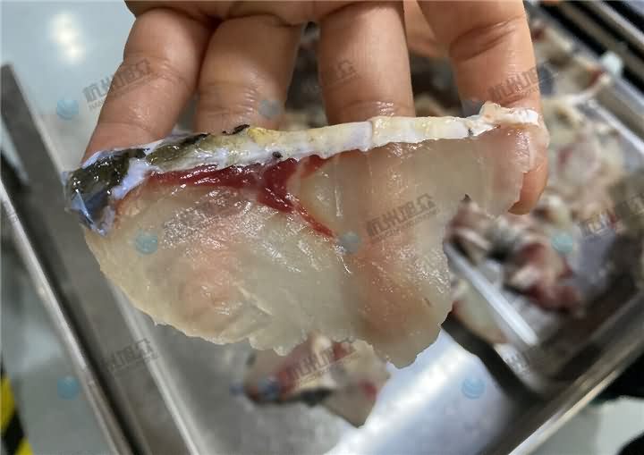 全自動切魚片機現場演示切草魚片,在切草魚片之前要做的工序,先去鱗開肚去內臟去魚頭后,再將魚大骨去掉,不去的話刀片容易損壞,所以要將魚大骨剃掉后再用魚片機30°斜度切成2.3mm魚片: