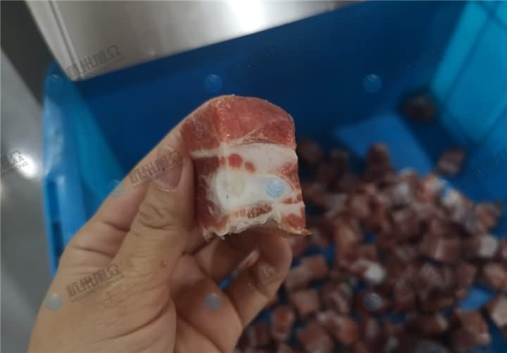 旭眾新款XZW-300魚禽肉類剁塊機可剁微凍過的肉類、禽類、小肋排等。大排、豬蹄、筒骨不建議用剁塊機哦!那么先看看魚禽肉類剁塊機剁肋排塊效果: