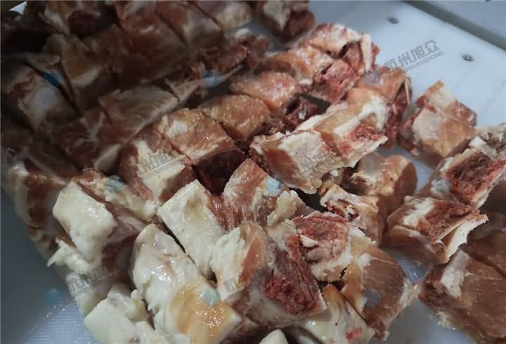 排骨可以選擇用禽肉類剁塊機(jī)剁塊嗎?可以的,小排,肋排都可以的哦,但是筒骨、豬蹄、大排等就不適合用剁塊機(jī)剁塊,得選擇自動(dòng)切骨機(jī)器。那么禽肉類剁塊機(jī)剁排骨塊效果: