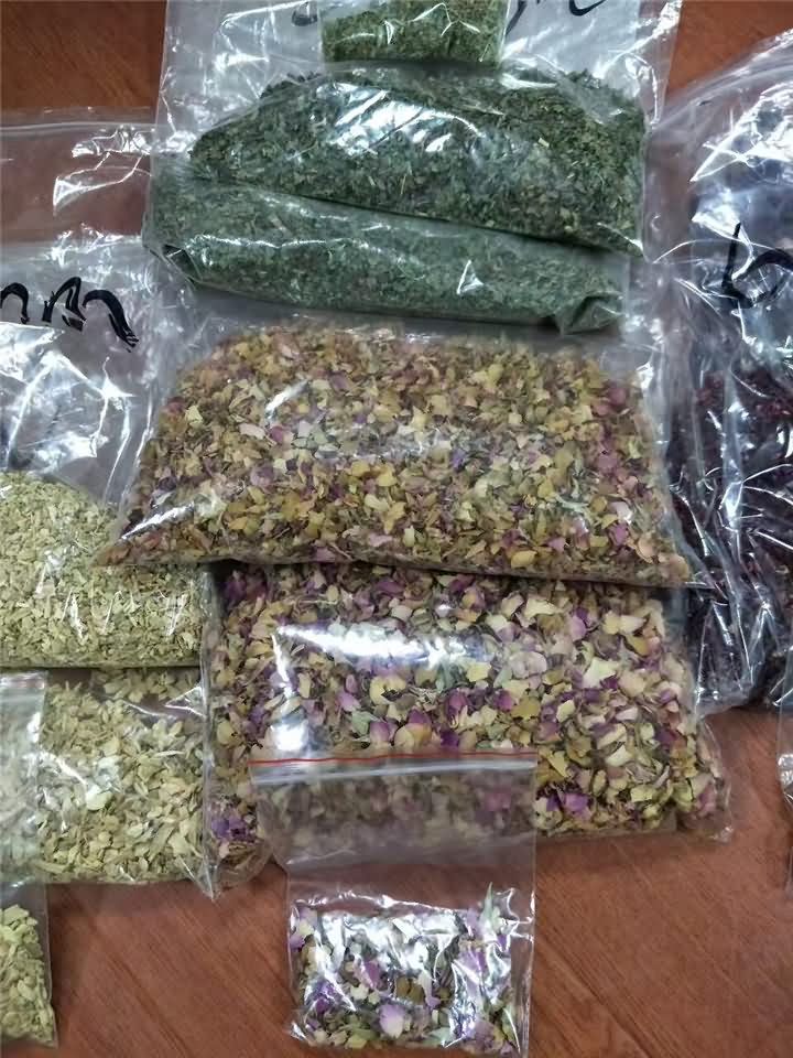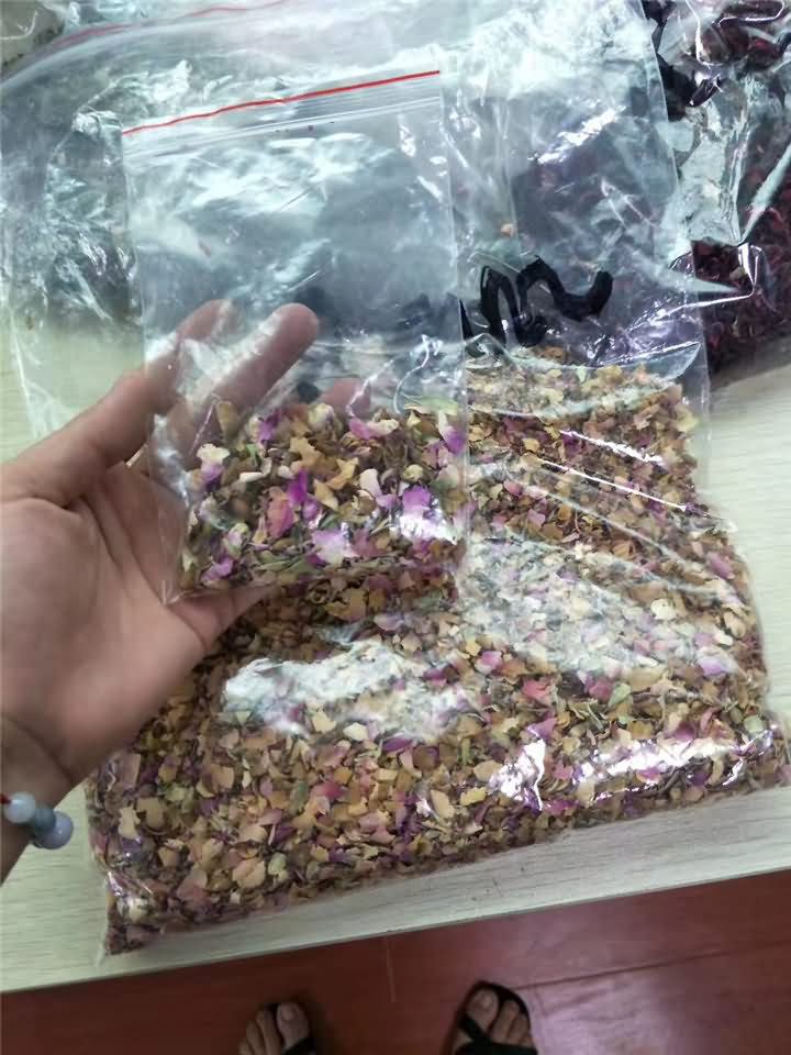 旭眾不銹鋼破碎機破碎篩網孔徑標配6mm或者8mm,另可定制10/12/14/16/18/20/30,一般不定制小于6mm的孔徑,遠在新疆的劉老板寄了他家烘干好的玫瑰花等物料來到現場,并直觀了用破碎機破碎后的效果: