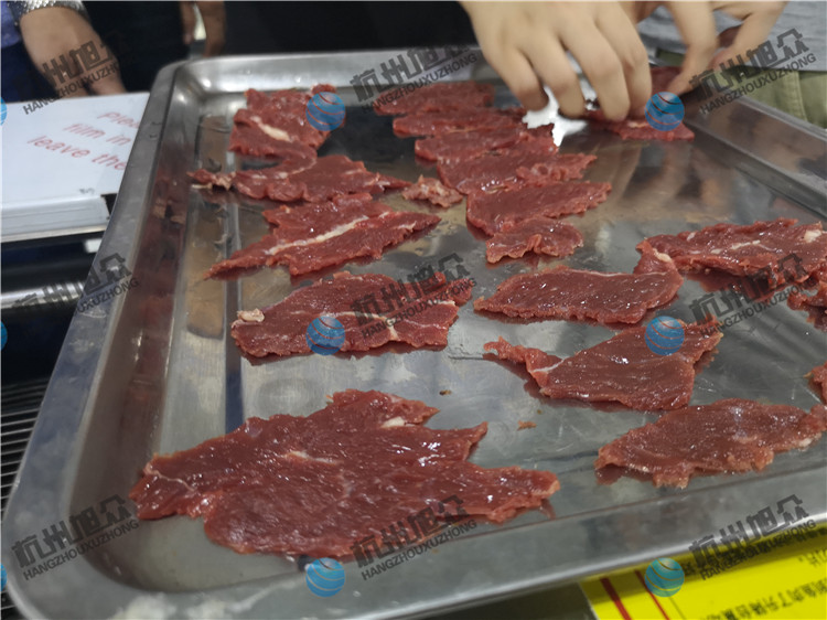 牛肉加工廠的福利,全自動斜切牛肉片/魚片機適用于肉類加工廠,魚類加工廠,大型餐飲行業(yè)等單位。全自動斜切魚片機切2.5mm鮮牛肉片效果如圖:
