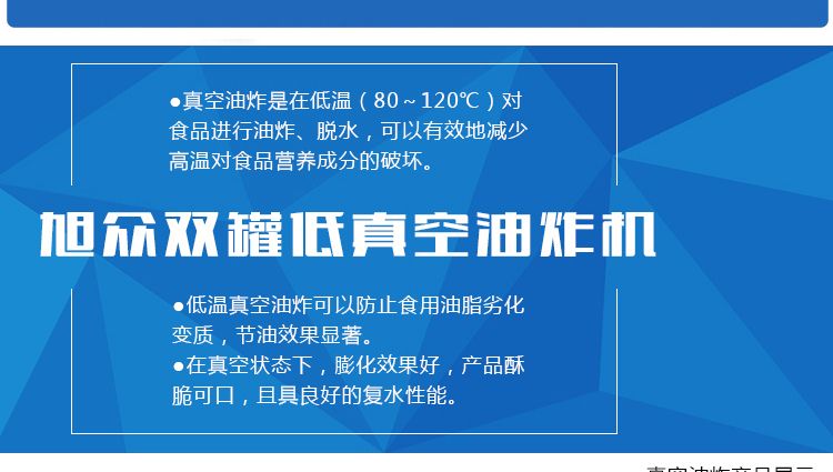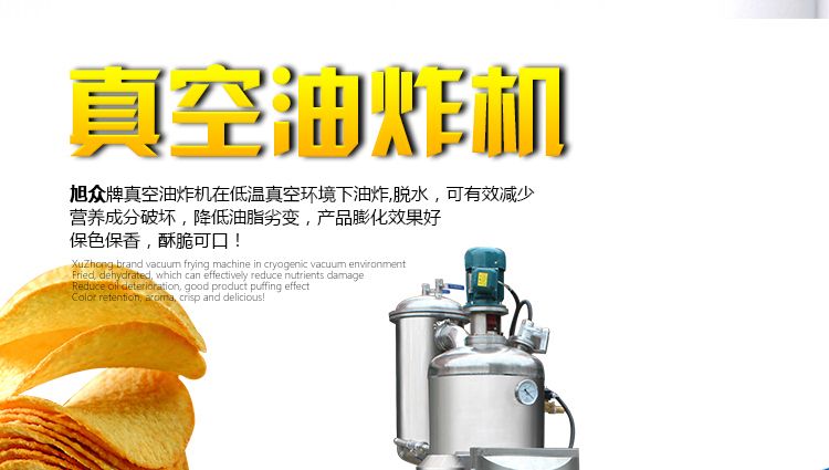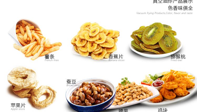 ●低溫真空油炸可以防止食用油脂劣化變質,可以提高油的反復利用率,降低成本。一般油炸食品的含油率高達40%~50%,而真空油炸食品的含油率在10%-20%,節(jié)油30%-40%,節(jié)油效果顯著。食品脆而不膩,可貯性能良好。