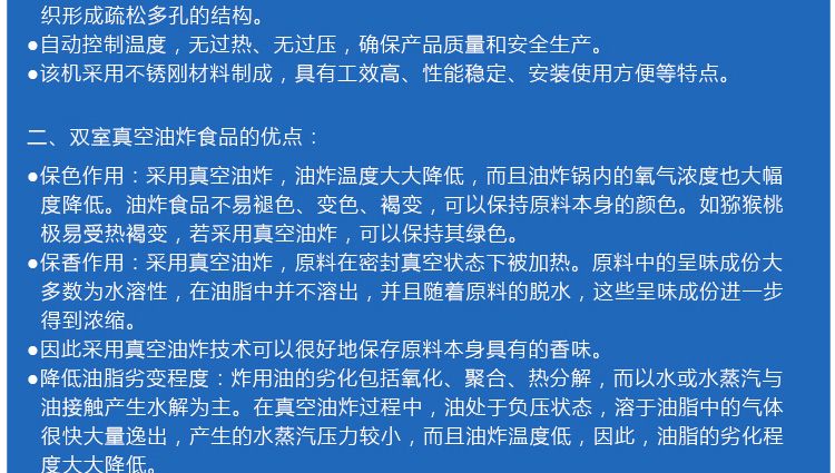 ●真空油炸是在低溫(80~120℃)對食品進行油炸、脫水,可以有效地降低高溫對食品營養(yǎng)成分的破壞。