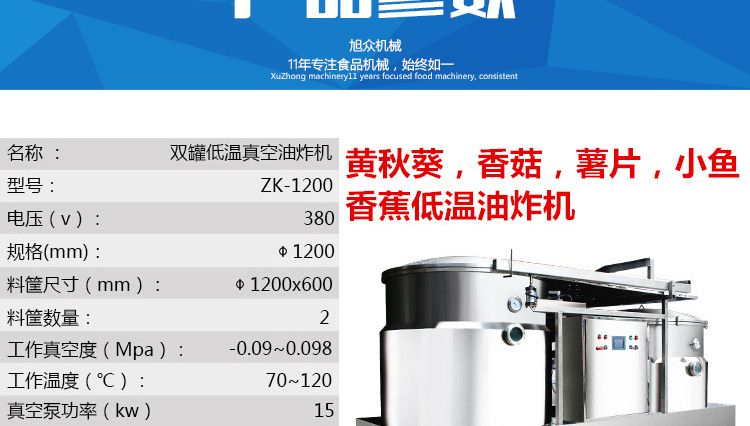 ZK-1200真空油炸機,適用于水果類、蔬菜類、干果類、水產品機畜禽肉類等。油炸食品不易褪色、褐色,可以保持原料本身的顏色